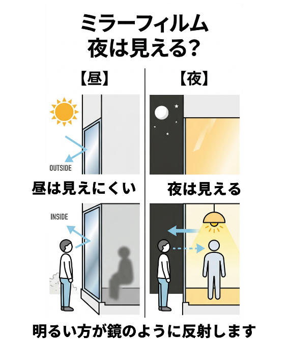 このため、「昼は見えにくいけど夜は見える」というのがミラーフィルムの基本的な特性です。
